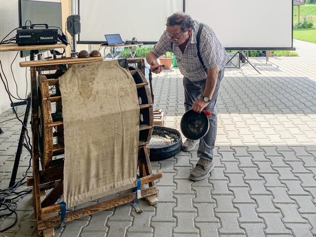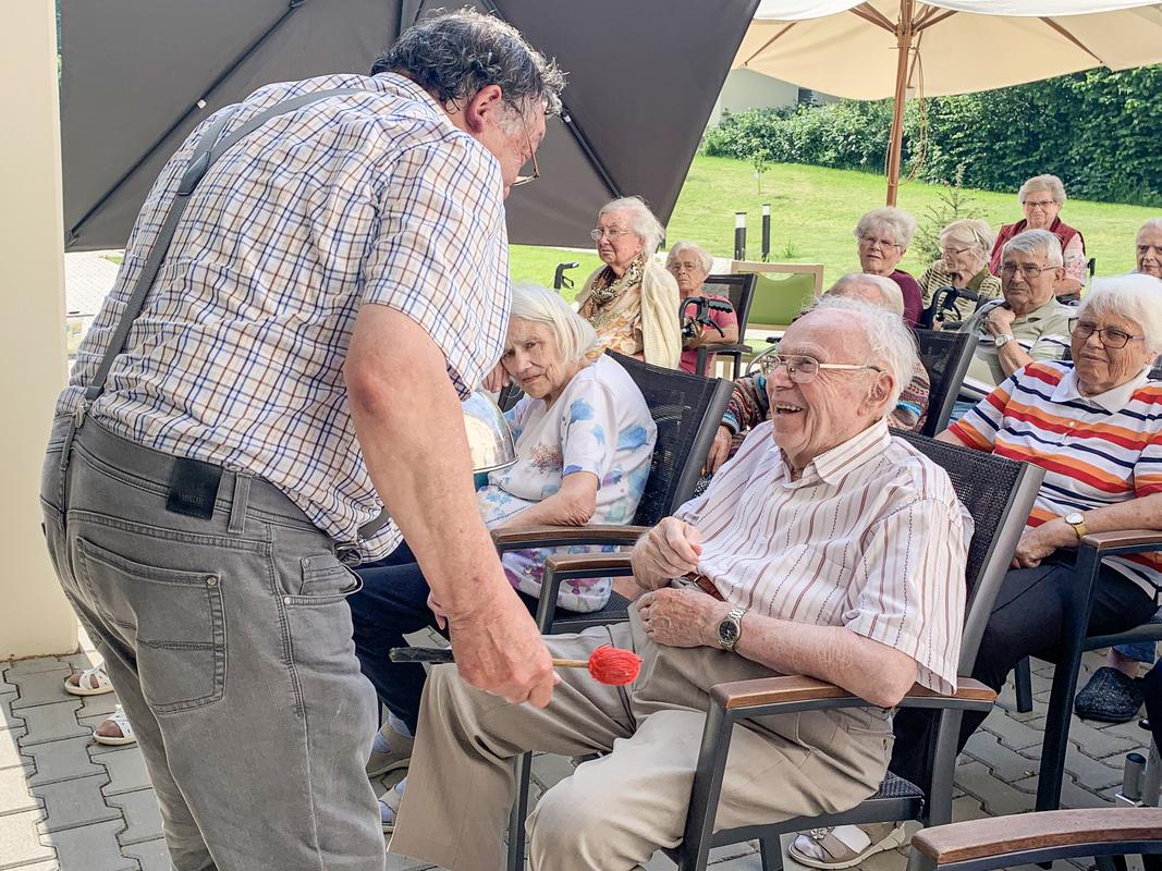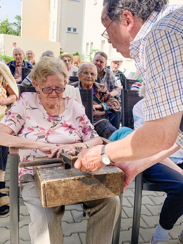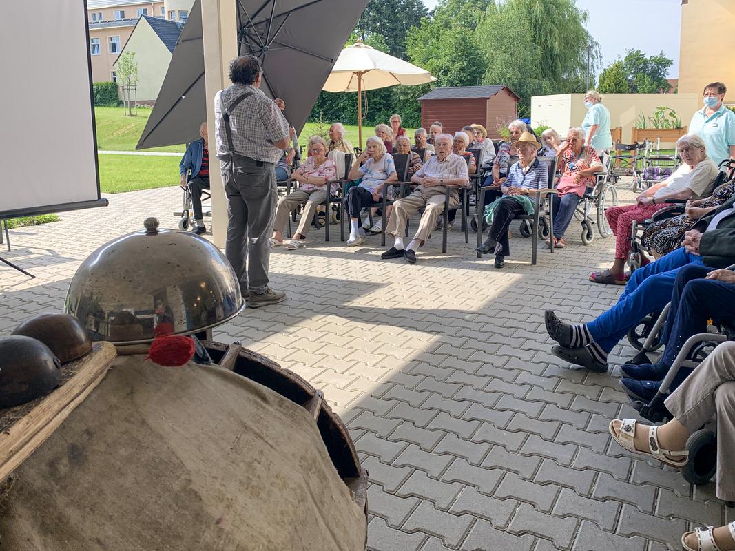 Gestern besuchte uns Herr Meister, der Erfinder der Theatereffekte-Programme. Er war viele Jahre lang Oberrequisiteur des Staatstheaters in Weimar. Geräusche sind seine Welt, deshalb wirkte er bei unzähligen DEFA-Filmen mit. Jedoch ist das nicht das einzige Talent, Herr Meister ist mit Leib und Seele Geschichtenerzähler. Aufgrund der Liebe zum Theater entwickelte er in den 80er-Jahren das Format des „Mitmach-Theaters“. Geschichten werden von ihm lebendig erzählt und die Geräusche noch von Hand erzeugt. Natürlich durften auch unsere Senioren viele Geräusche, wie den Donner, knatschende Türen, Pferdegalopp und auch Wind, selbst erzeugen. Es war faszinierend, mit welchen Mitteln verschiedenste Geräusche erzielt werden.