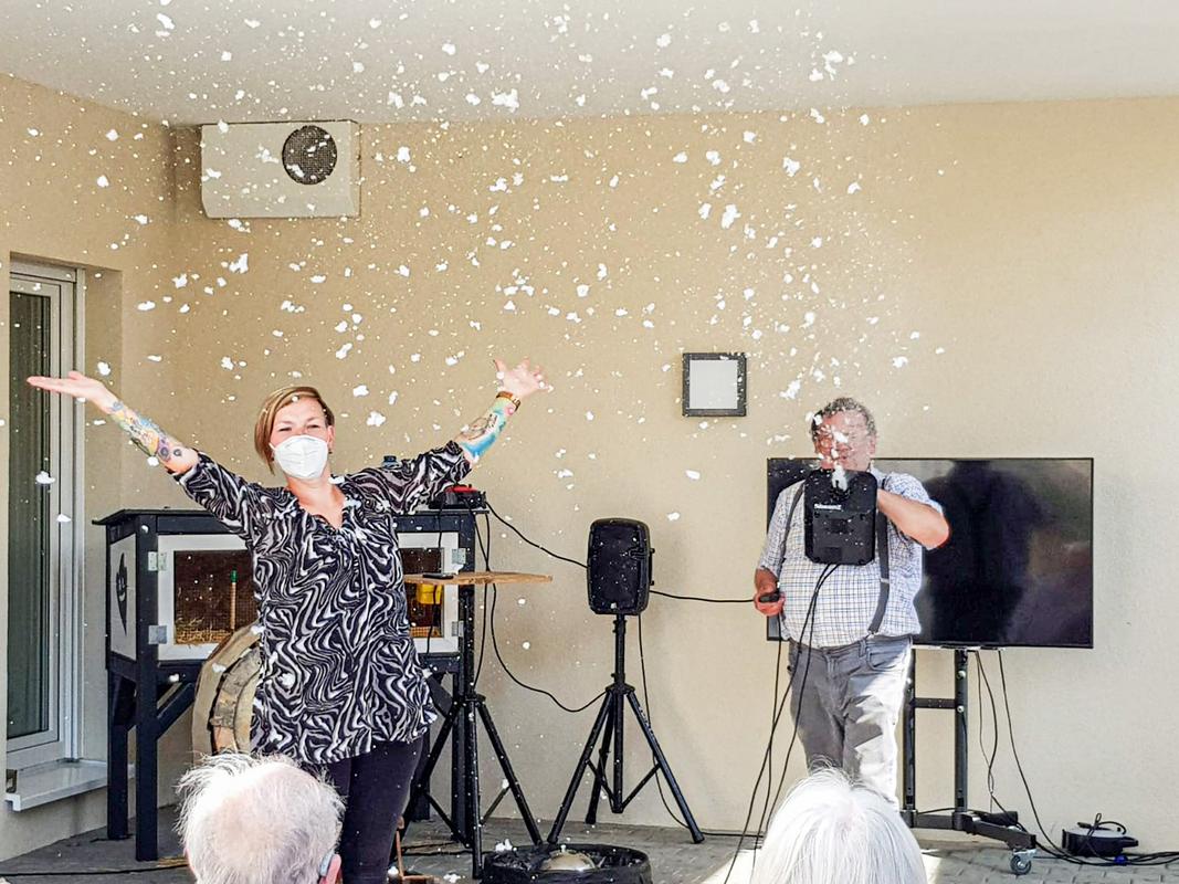 Doch am schönsten war der Abschluss, denn da durfte Frau Preuß (Verantwortliche Sozialdienst) bei sommerlichen Temperaturen Schnee produzieren.